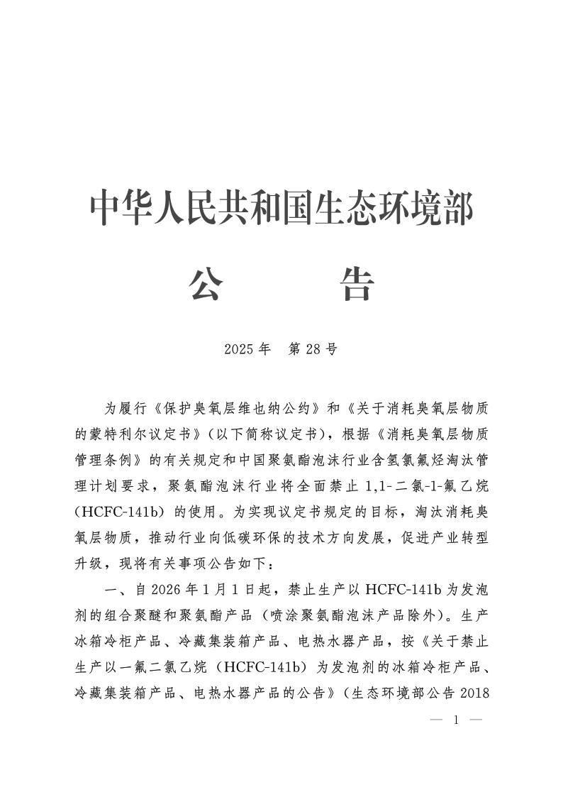 关于禁止生产以1,1—二氯—1—氟乙烷(HCFC—141b)为发泡剂的聚酯产品的公告