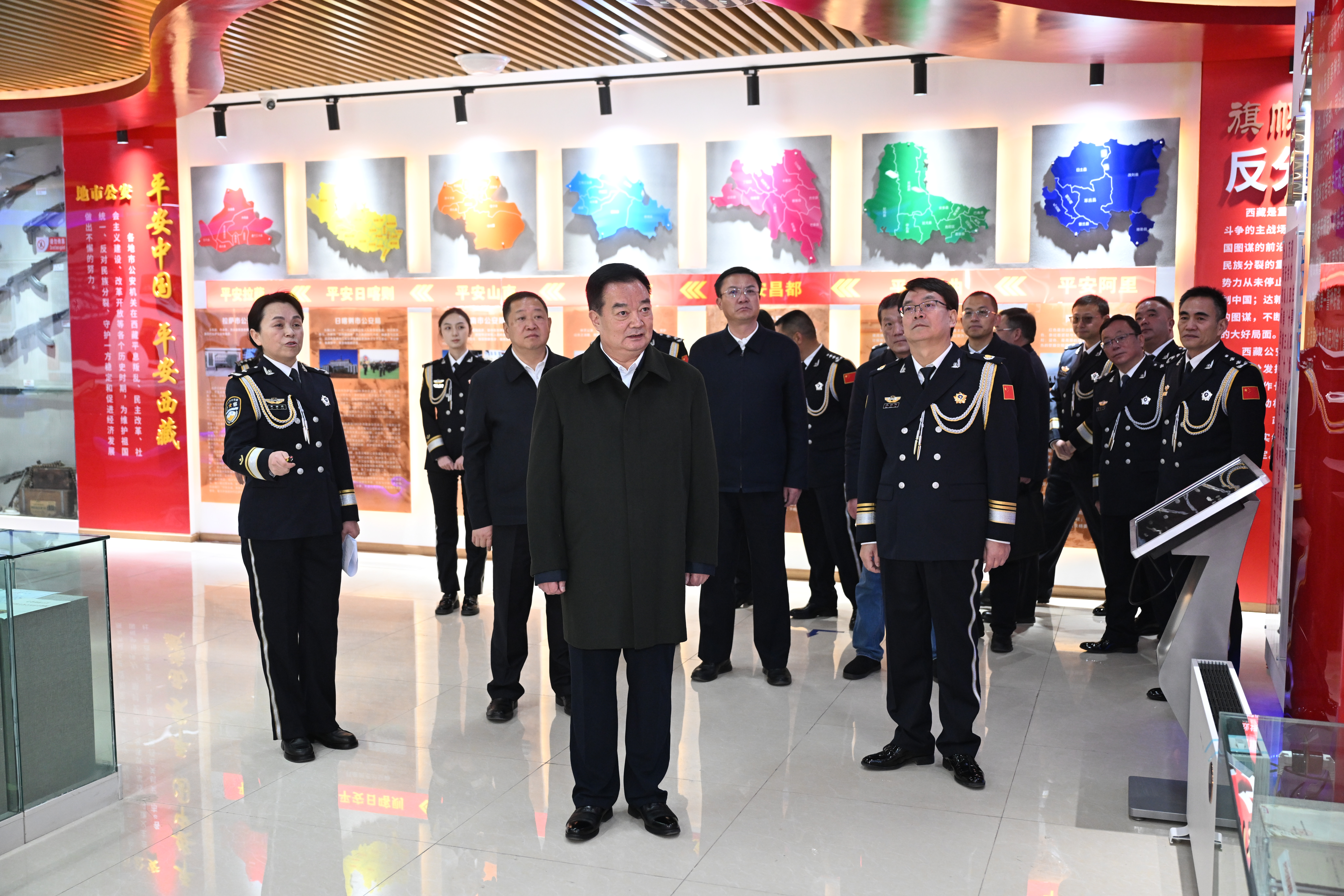 近日,自治区党委书记王君正来到自治区公安厅看望公安民辅警。这是王君正在警史馆里认真听取讲解,详细了解有关情况。记者 旦增西旦 摄