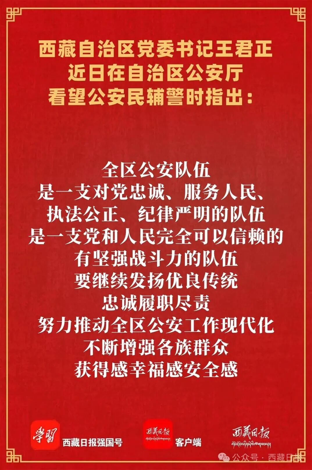 全区各级公安机关和广大公安民辅警表示,新征程上,将深入学习贯彻习近平总书记关于新时代公安工作、西藏工作的重要指示和新时代党的治藏方略,聚焦“四件大事”聚力“四个创建”,强化政治建警,坚持忠诚履职,坚守为民情怀,坚持依法治藏,坚持从严治警,努力打造忠诚干净担当的公安铁军,为建设社会主义现代化新西藏作出更大贡献。