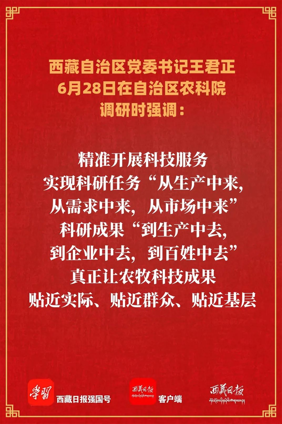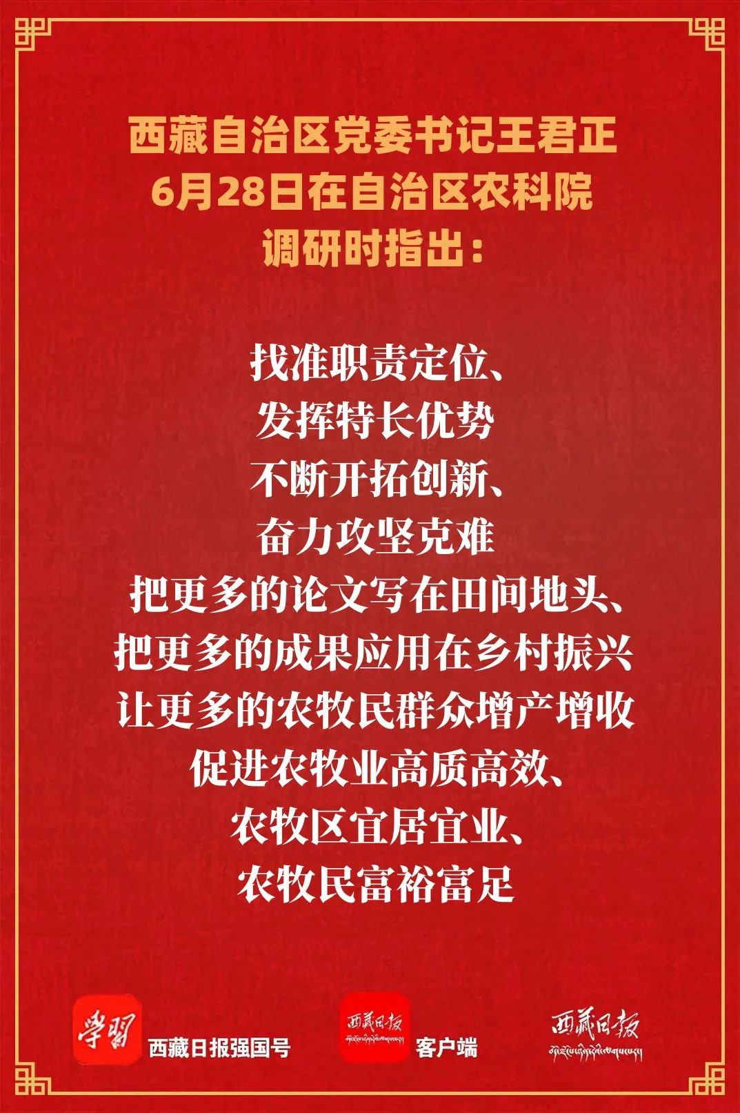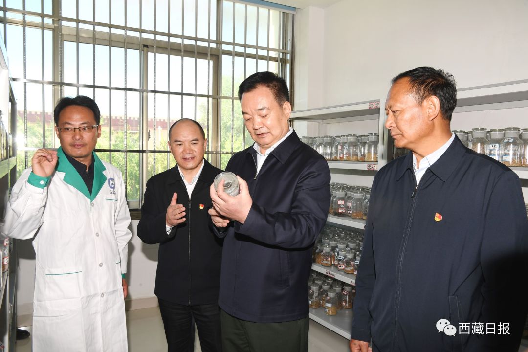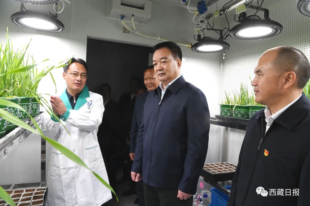 6月28日,自治区党委书记王君正来到自治区农牧科学院调研。这是王君正在省部共建青稞和牦牛种质资源与遗传改良国家重点实验室核心种质资源室,详细了解青稞育种情况。记者 李洲 摄王君正强调,全区农牧科研系统要立足西藏经济社会发展大局,加强科技攻关。强化农牧业科技基础性工作、基础与应用研究、关键核心技术攻关、技术集成创新与熟化、技术转移转化之间有效衔接,强化青稞、牦牛、饲草等品质选育,加快育种研发应用和养殖技术攻关,不断提高科技贡献率,为西藏农牧产业提质增效提供技术保障。要坚持以需求为导向,加快科技成果转化。围绕青稞种植、畜牧养殖、疫病防治、经济林果、食品加工等内容,推进产学研用深度融合,深化良种繁育、良法配套、良田改造,精准开展科技服务,实现科研任务“从生产中来,从需求中来,从市场中来”,科研成果“到生产中去,到企业中去,到百姓中去”,真正让农牧科技成果贴近实际、贴近群众、贴近基层。要突出特色优势,加快推进农牧业规模化、产业化、品牌化发展。促进科研和产业联手,建立健全科研成果转化利益分享机制,切实把市场需求“请进来”,把优质成果“送出去”,大力发展特色农产品精深加工产业,促进优势特色主导产业转型升级,拓展增值增效空间。要创新工作方法,加强农牧业技术宣传推广应用。深化科技特派员制度,引导科技特派员结合服务地区的特色农牧产业,实施关键技术攻关、转化应用先进科技成果,组织开展培训,强化政策宣传,促进科技进村、入户、到田间地头,提升农牧区实用人才素质能力。要加强人才队伍建设,不断提升科研工作水平。扎实推进“育引用留”四大工程,加快完善农牧科技人才队伍建设体制机制,深化急需紧缺人才及高层次人才引进,建立有效激励机制,形成人尽其才、才尽其用、用有所成的良好局面。广大农牧科技工作者既要仰望星空又要脚踏实地,进一步创新科研工作思路,突出重点、突破难点,专注创新、潜心钻研,努力多出成果、出大成果。调研中,王君正听取自治区农科院主题教育开展情况汇报,强调,要高标准高质量推进主题教育,坚持问题导向、目标导向、结果导向,把理论学习、调查研究、推动发展、检视整改贯通起来,有机融合、一体推进,在真学真懂、真调深研、真检实改、知行合一上持续用力,激活力、扬优势,用农牧业科技创新成果检验主题教育实际成效,为推进我区农牧业高质量发展作出新贡献。