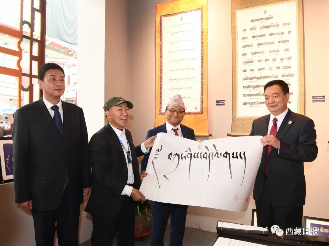 这是中国西藏旅游文化国际博览会期间,王君正向尼泊尔联邦院主席加内什·普拉萨德·蒂米尔西纳赠送藏文书法作品。记者 李洲 摄