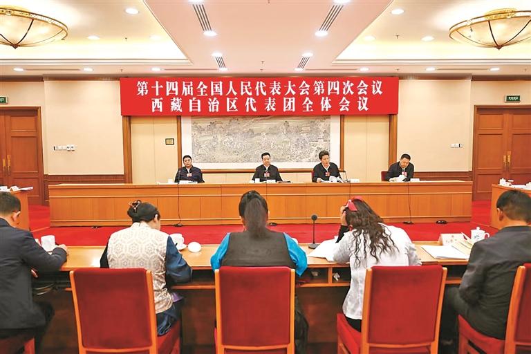 全国人大常委会副委员长洛桑江村参加审议。西藏代表团团长、自治区党委书记王君正,西藏代表团副团长、自治区党委副书记、自治区人大常委会主任严金海发言。西藏代表团副团长、自治区党委副书记、自治区主席嘎玛泽登主持。